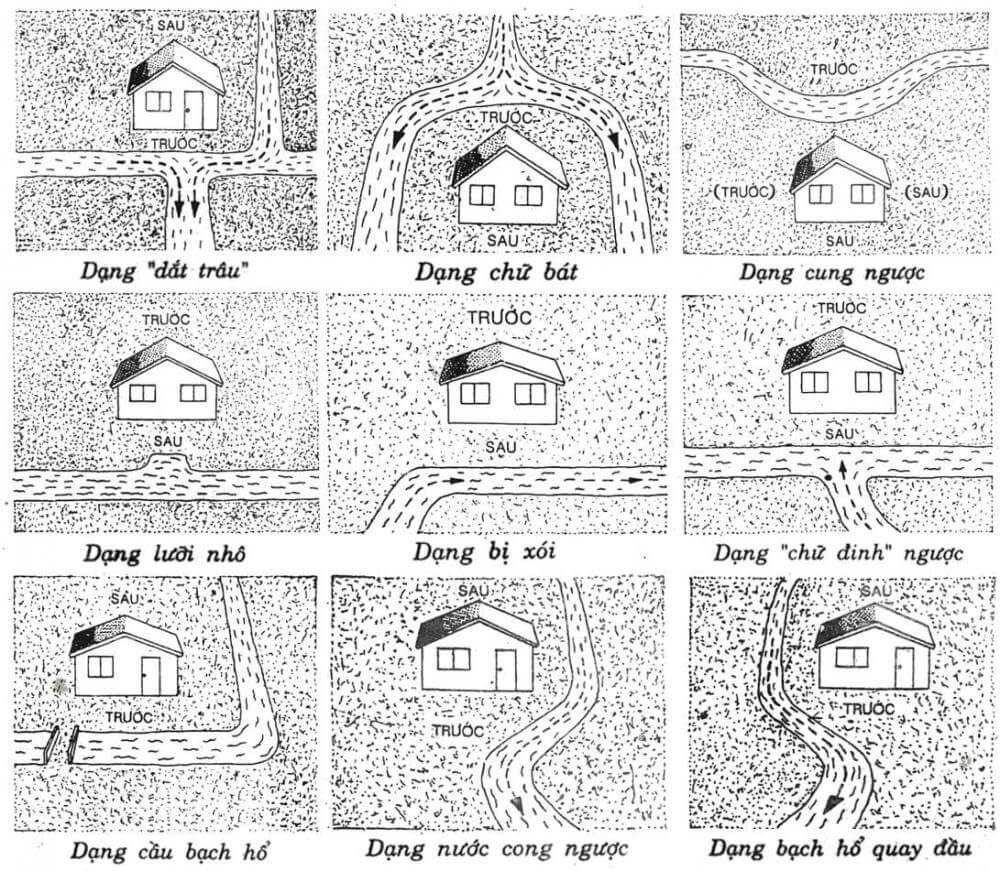 – Đất cạnh ao hồ nhưng dòng chảy uốn cong ra khỏi nhà hoặc nhà có đường phản cung, cung đường cong ra ngoài không ôm lấy nhà: đều không tụ khí;